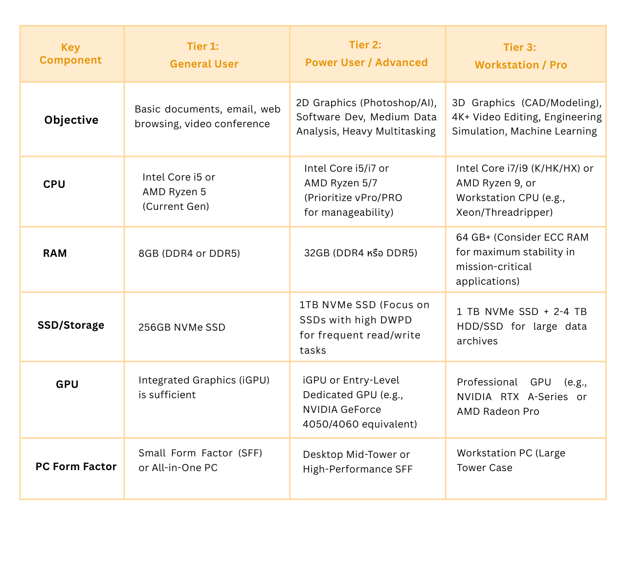 Tier 3 (Workstation / Pro User): Requires high-performance computing for intensive tasks such as 3D graphics (CAD/Modeling), 4K+ video editing, engineering simulations, and Machine Learning.
