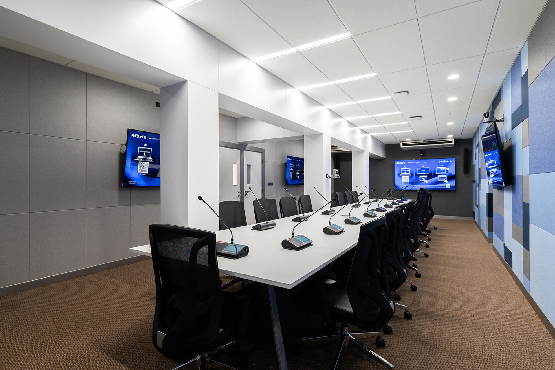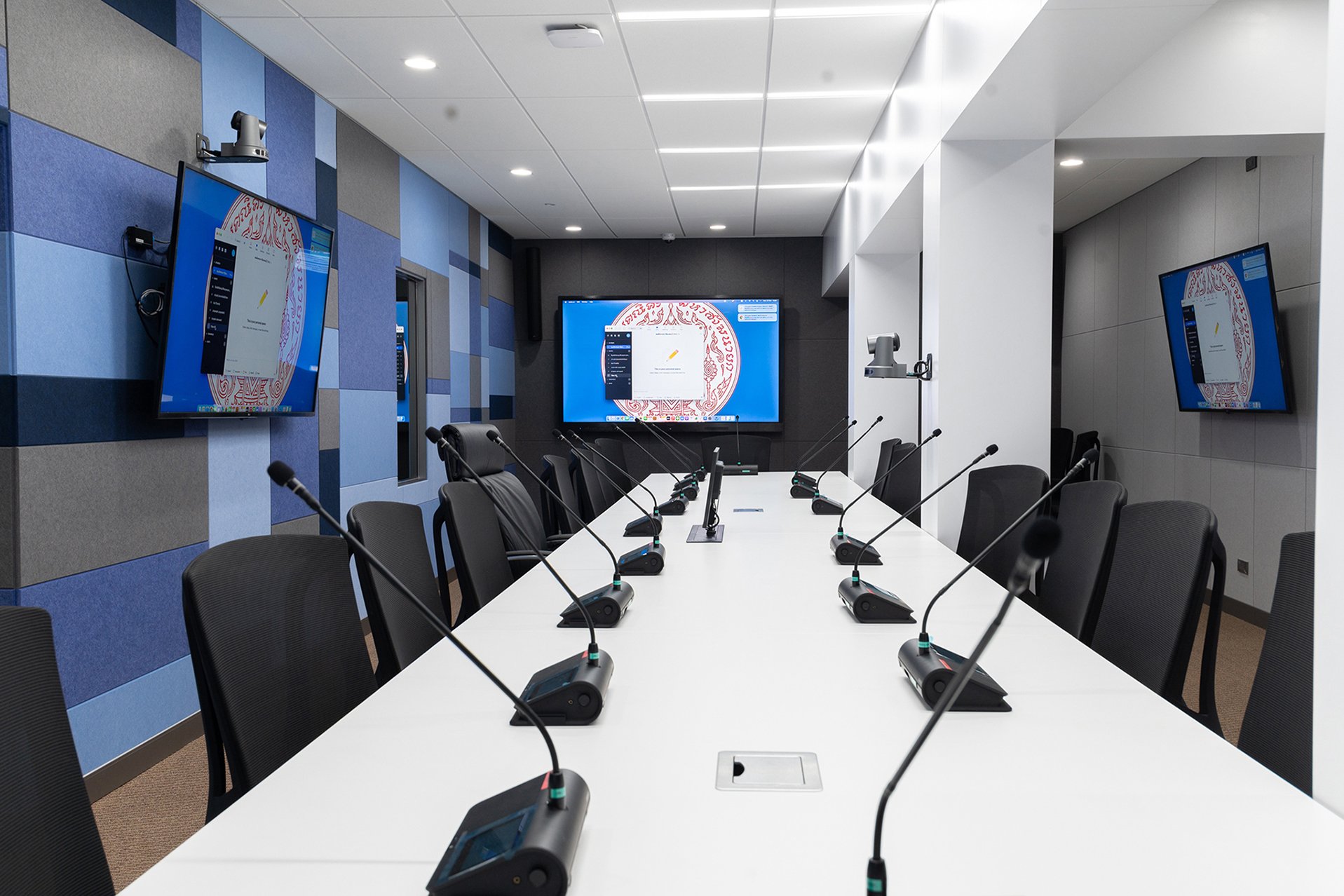 โดยออกแบบห้องให้ดูทันสมัย ผนังและฝ้าเพดานสามารถซับเสียงได้ดีภายในห้องประชุม มีระบบทีวีใช้แสดงข้อมูลต่าง ๆ เช่น ข้อมูลนำเสนอในการประชุม, การประชุมผ่าน Video Conference ด้วยจอภาพขนาด 86 นิ้ว 2 จอ และ 65 นิ้ว 2 จอ พร้อมจอภาพแบบลิฟท์ปรับขึ้นลงได้ สำหรับประธานการประชุม สามารถแสดงข้อมูลได้หลายแหล่งพร้อมกันได้